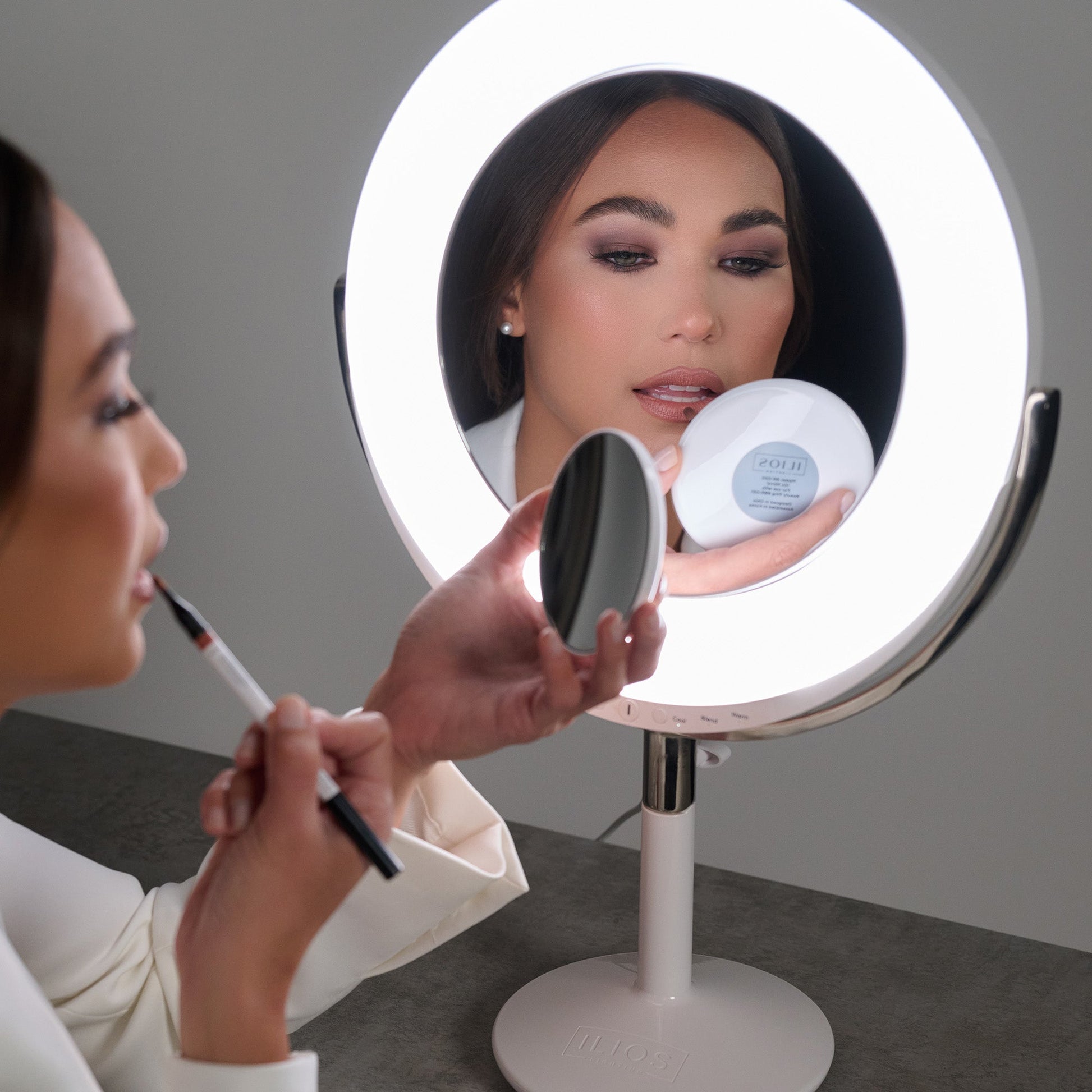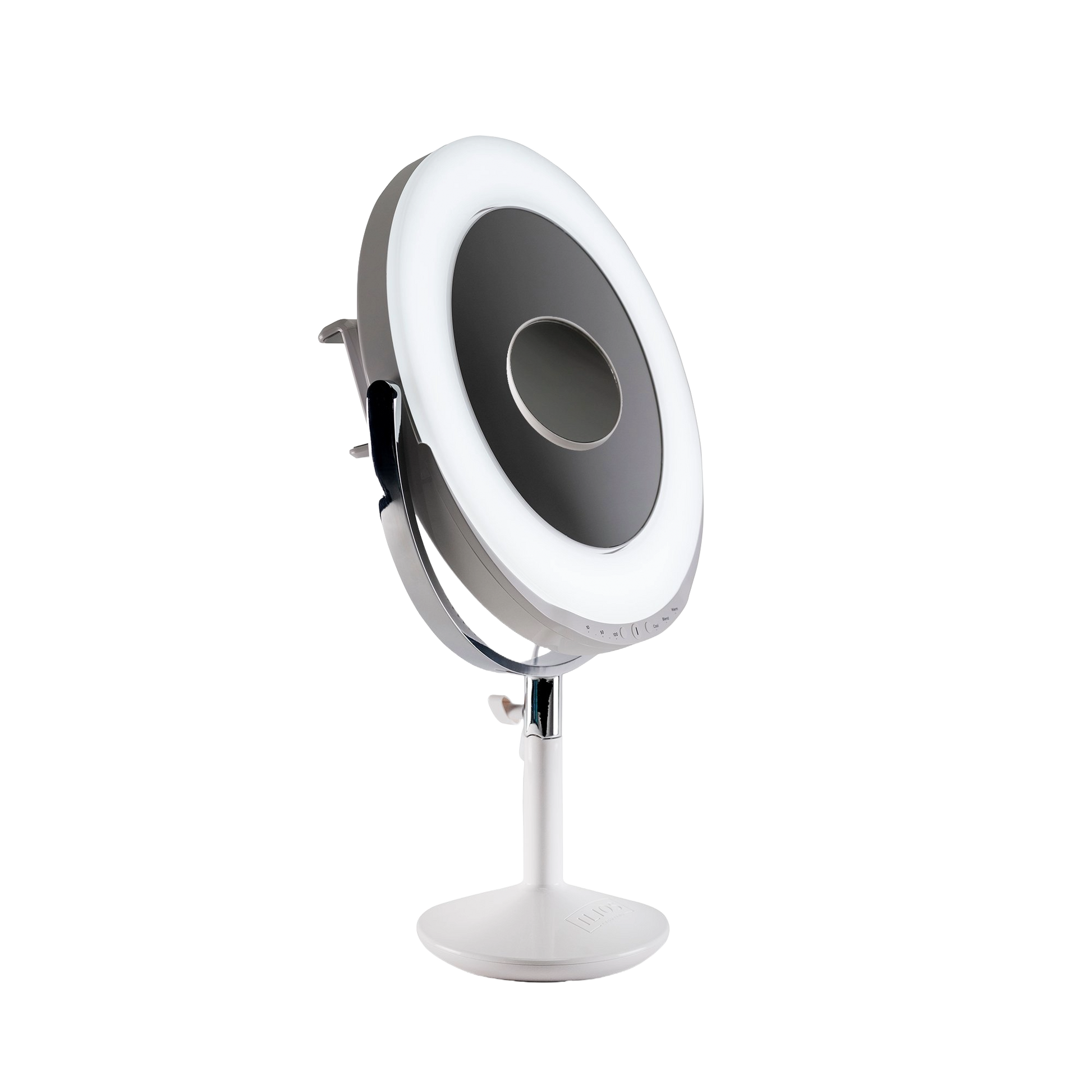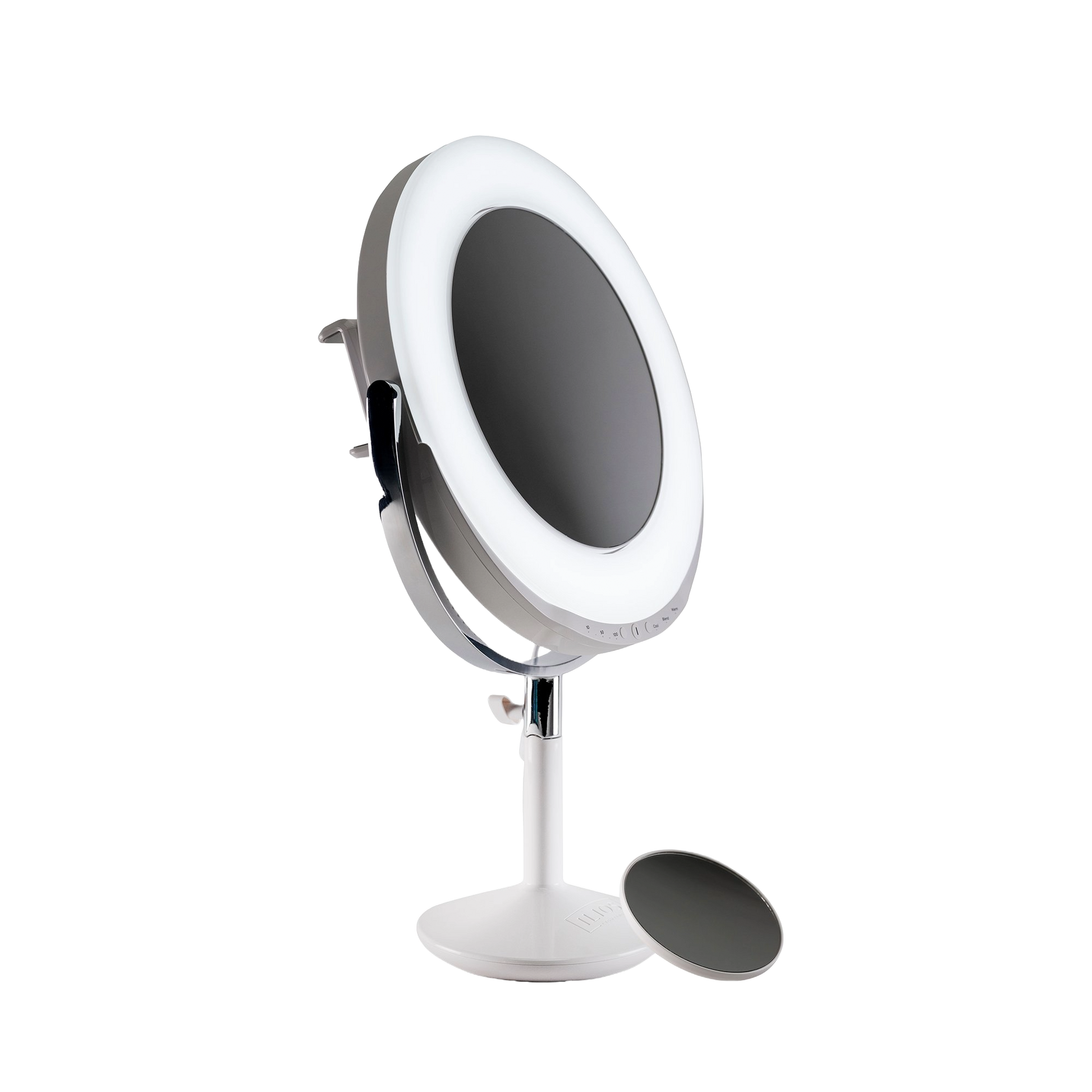 BACKORDERED UNTIL MID SEPT. Our makeup mirror replicates natural daylight for flawless application in any environment. Easily adjust brightness and color temperature. With 1x, 5x, and 10x magnification options, it caters to all needs. Plus, its built-in phone and webcam mount add versatility for content creation and video calls.