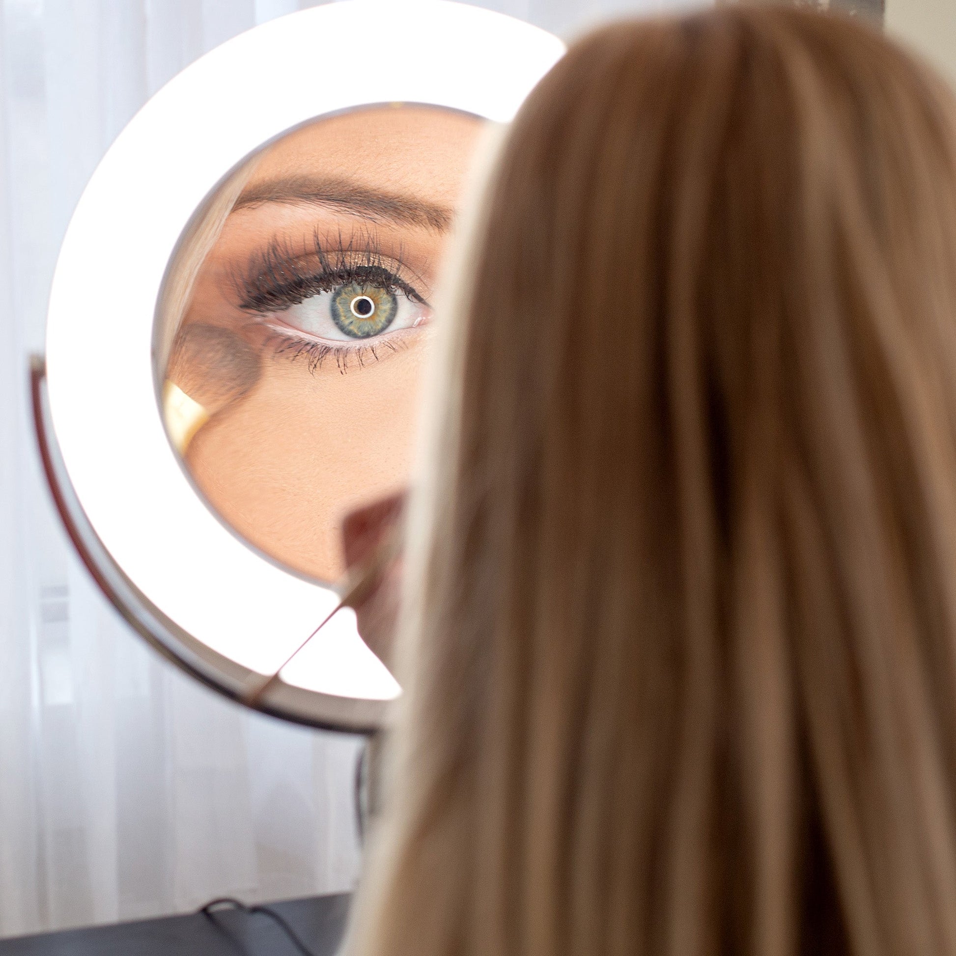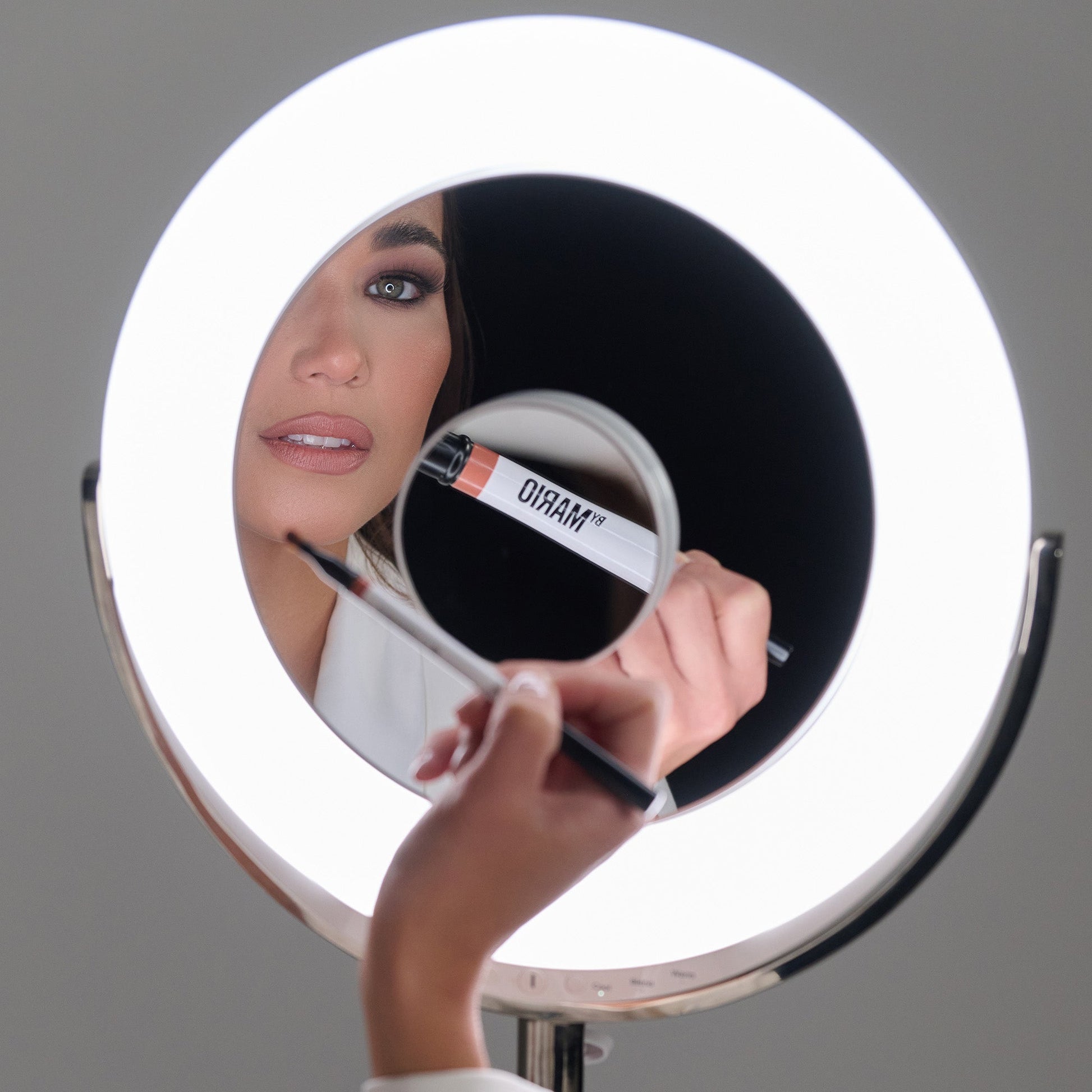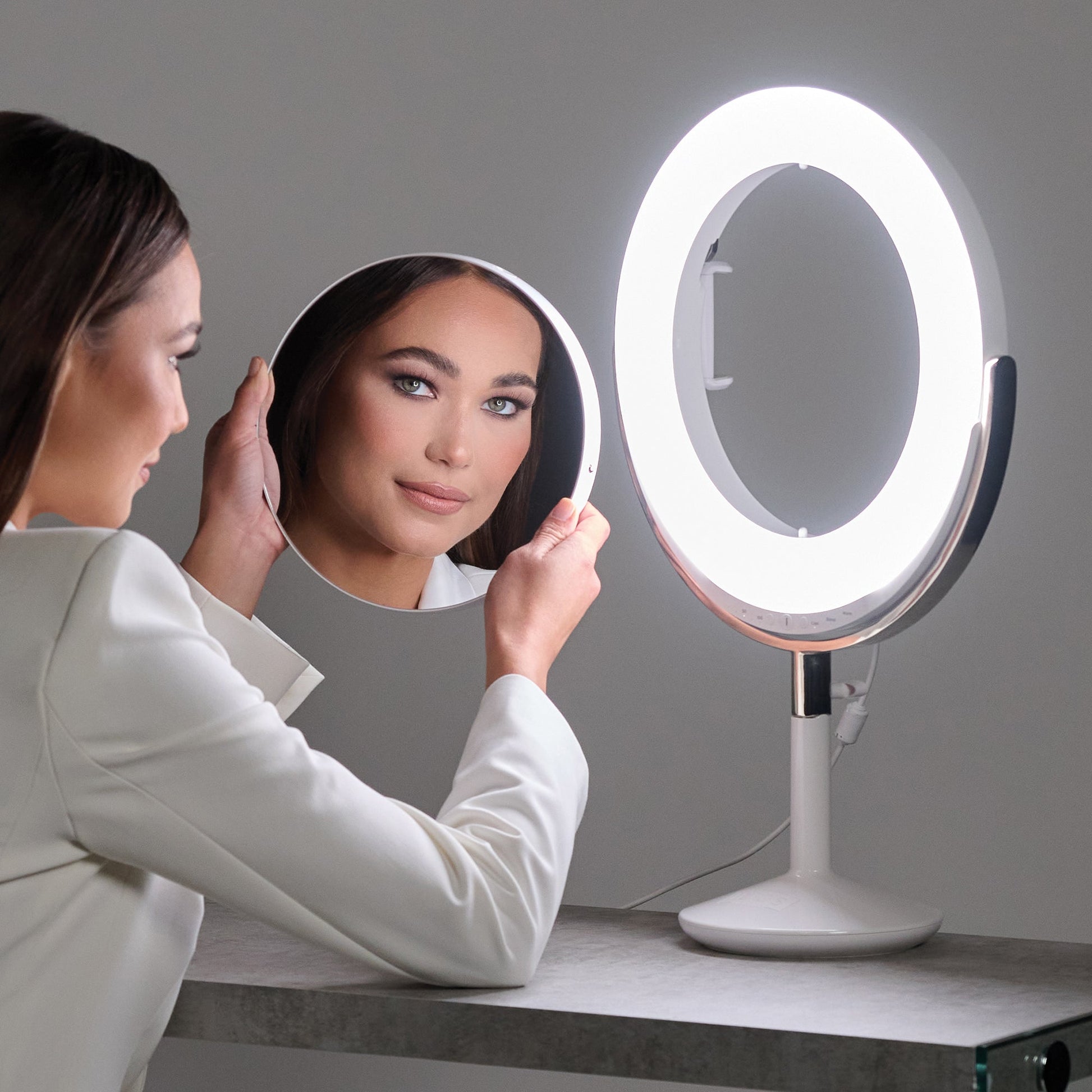 BACKORDERED UNTIL MID SEPT. Our makeup mirror replicates natural daylight for flawless application in any environment. Easily adjust brightness and color temperature. With 1x, 5x, and 10x magnification options, it caters to all needs. Plus, its built-in phone and webcam mount add versatility for content creation and video calls.